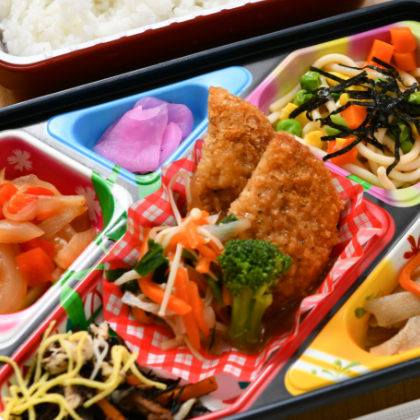 こだわりの国産米・野菜中心のおかずが5品以上。バランスのよい季節ごとのメニューが楽しめるお弁当です。